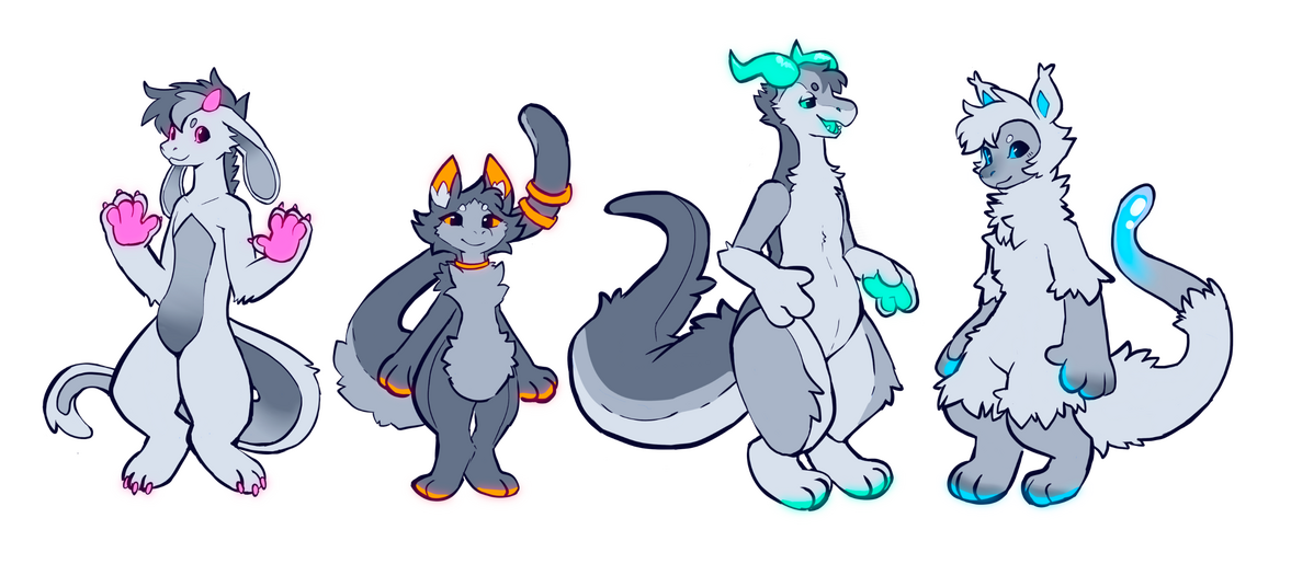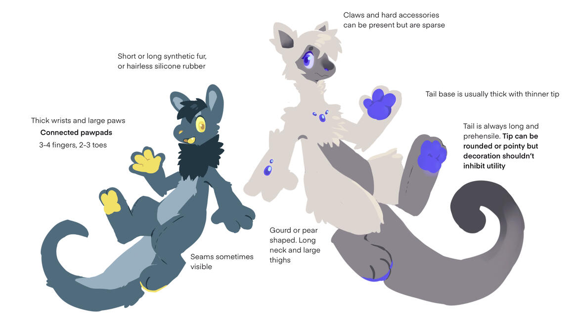 - Design typically consists of one “base” color, one or two “secondary” colors, and a main “accent” color on the inner flesh, eyes, and paws. The accent color should always be the most saturated color in the palette.